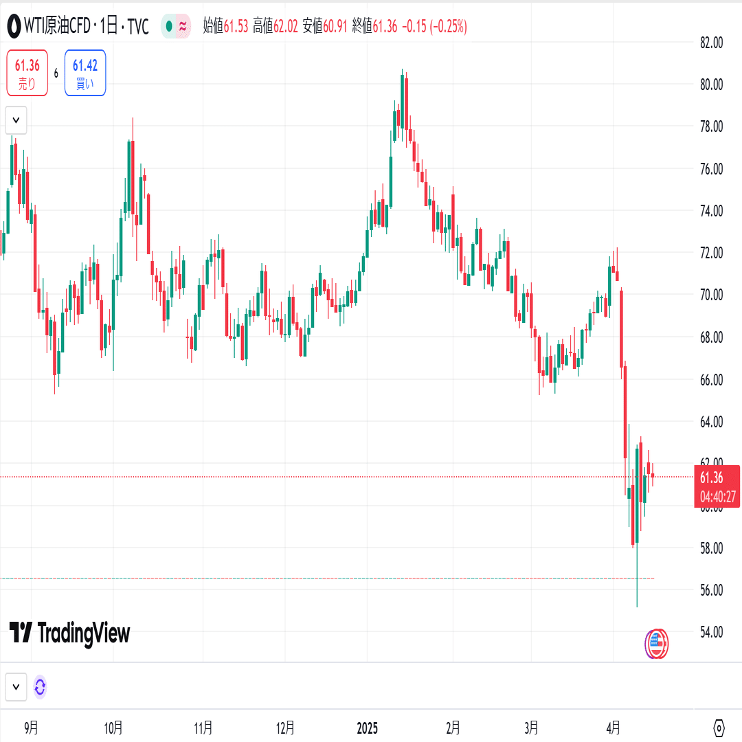 4月1日から4月8日まで下落が続き、一時1バレル56.06ドルになりました。しかし、4月9日にアメリカのトランプ大統領が90日間の相互関税停止を発表したことから、市場の安心感に繋がり価格が反発しました。
