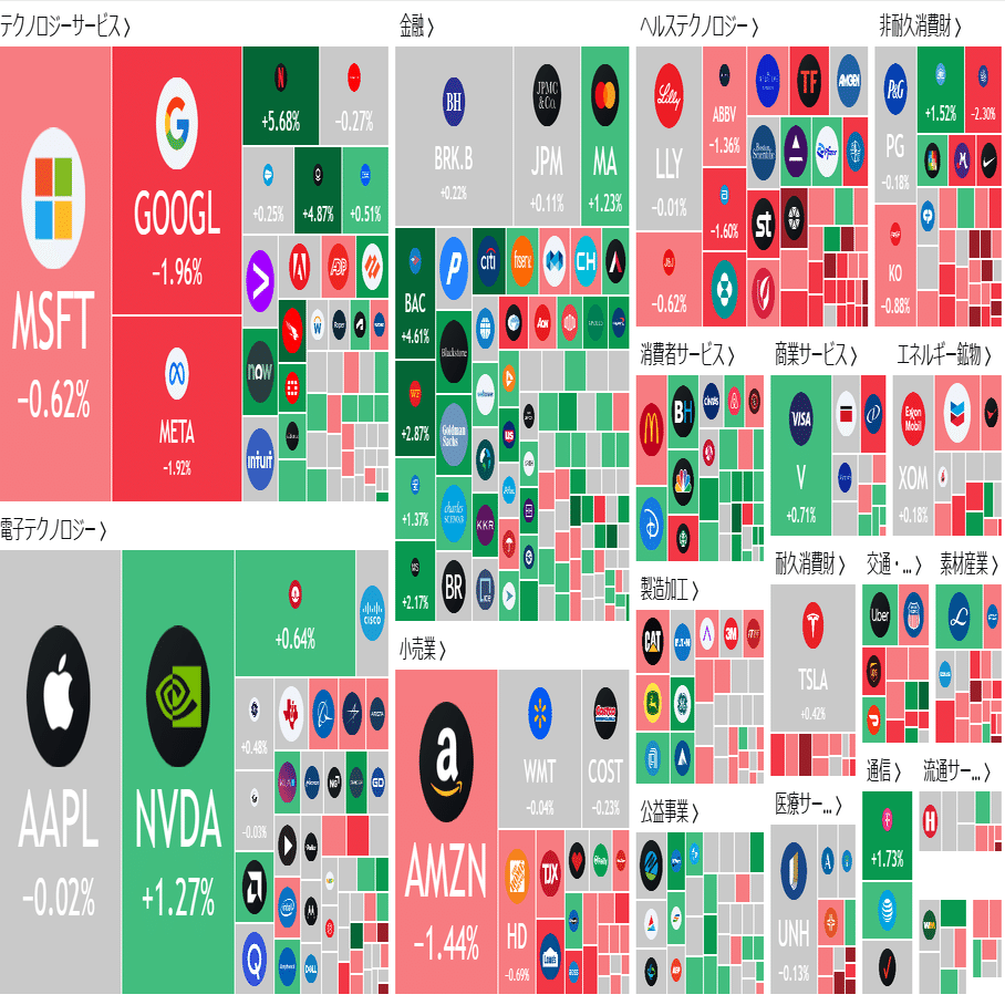 テクノロジーサービスのセクターに下落が目立ちます。しかし、Netflixは+5.68%、PALANTIR+4.87%上昇しました。Netflixは4月17日に決算を控えており、投資家が好決算と予想したため買いが入ったと考えます。