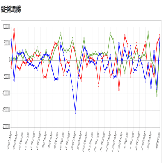 青い線が海外投資家、赤い線が国内の個人投資家、緑の線が国内の法人を指しています。