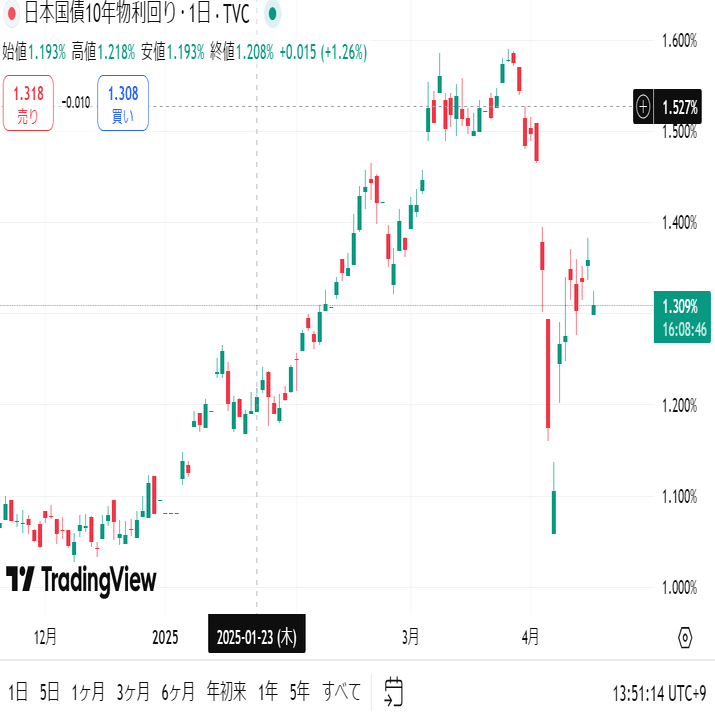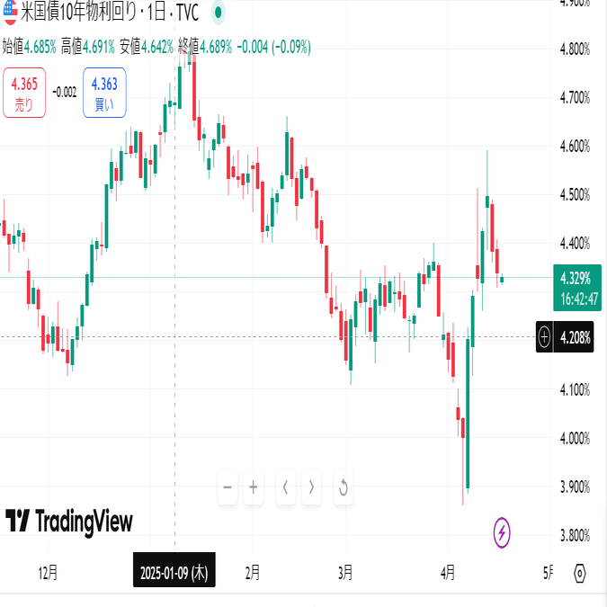 また中国、日本などが米国の関税政策に対抗するため自国通貨下げ行動に出ました(多分)。その資金捻出のために、保有してる米国債を売っています。そのため、価格が下がって利回りが上昇している背景もあります。