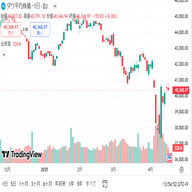 ダウ平均は40368.97ポイントでトランプ米大統領が相互関税の対象から電子機器類を一時停止する方針を示し、税率緩和への思惑からハイテク株を中心に買われました。