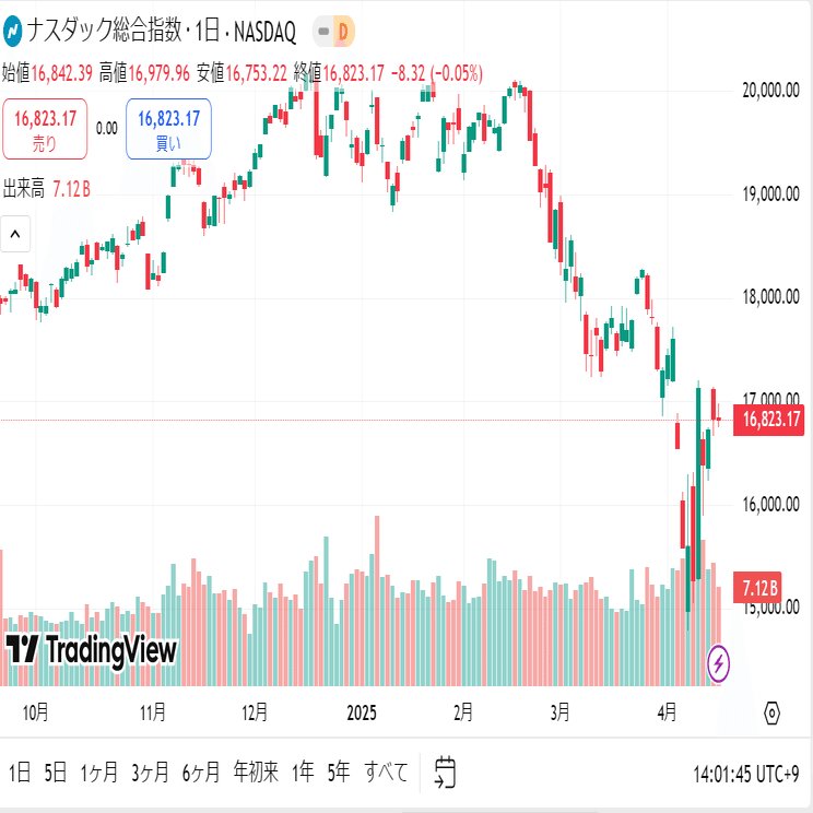 NASDAQ総合指数は16823.17ポイントでした。ハイテク株を中心に構成されるNASDAQ、アップルやエヌビディアなど、半導体を輸入に頼る企業が多く、米トランプ大統領の相互関税の影響を受けました。