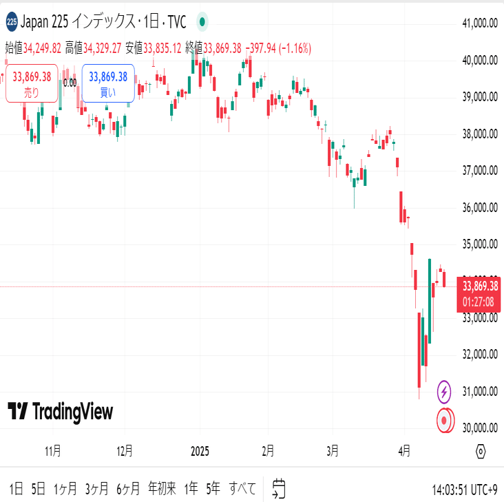 日経平均株価は33869.38円でトランプ政権が相互関税の自動車部品の一時免除について検討していると伝わり、トヨタ自動車などの自動車関連を中心に買いが入りました。