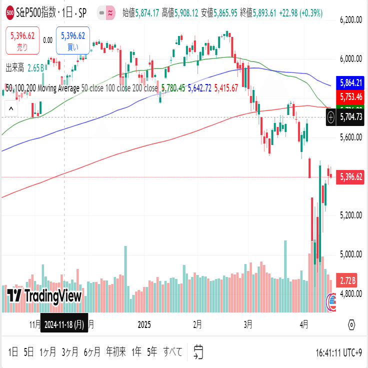 S&P500種指数は5396.62ポイントでこの週末、米トランプ大統領が相互関税などの対象からスマートフォンといった電子機器を除外すると発表したことで、アップルなどのテクノロジー関連株が上昇したため、市場全体を押し上げましたが、指数終値の50日移動平均が200日移動平均を上から下へ突き抜けいるため警戒感が高まっています。